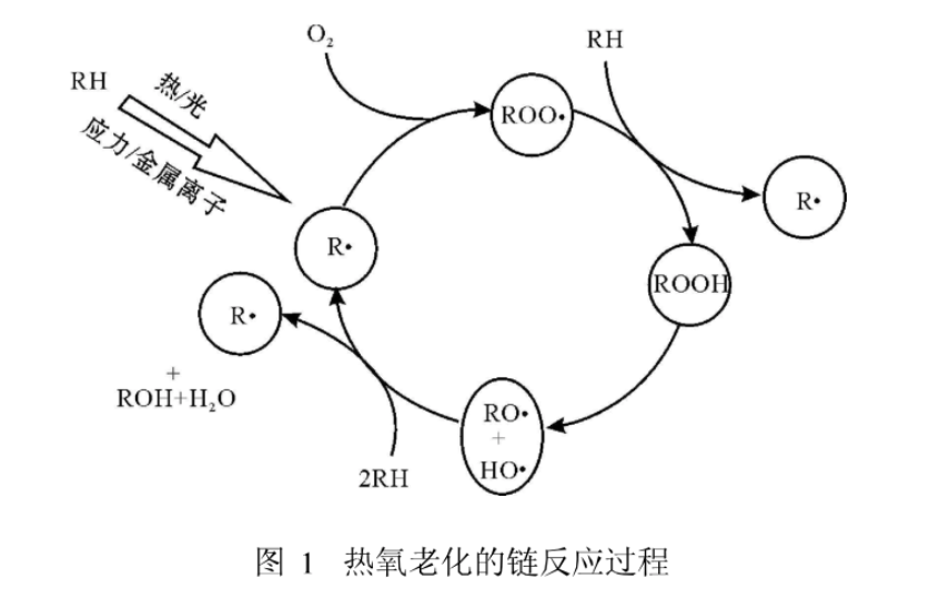 聚合物的老化是一種自動氧化反應(yīng),目前最常用的方法是在高分子聚合物加入抗氧劑,防止或阻緩高分子聚合物氧化工程。它可以捕捉活性游離基生成非活性游離基,或者分解氧化過程中的聚合物,使其終止鏈鎖反應(yīng)。